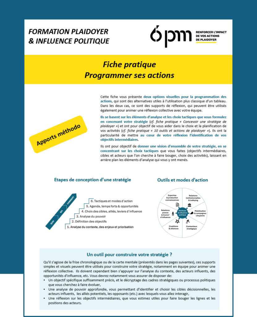 On met à jour régulièrement nos fiches méthodo de formation en espérant qu’elles vous soient utiles dans votre quotidien pour travailler sur vos stratégies d’influence et de plaidoyer.
