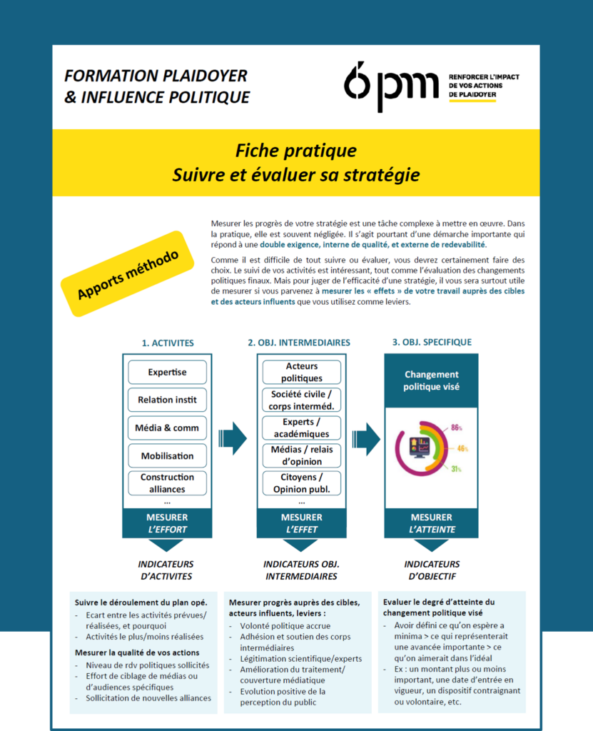 Une fiche d’indicateurs pour vous aider à mesurer les effets de votre stratégie d’influence et à réfléchir les objectifs intermédiaires que vous pourrez vous fixer pour atteindre les changements recherchés!